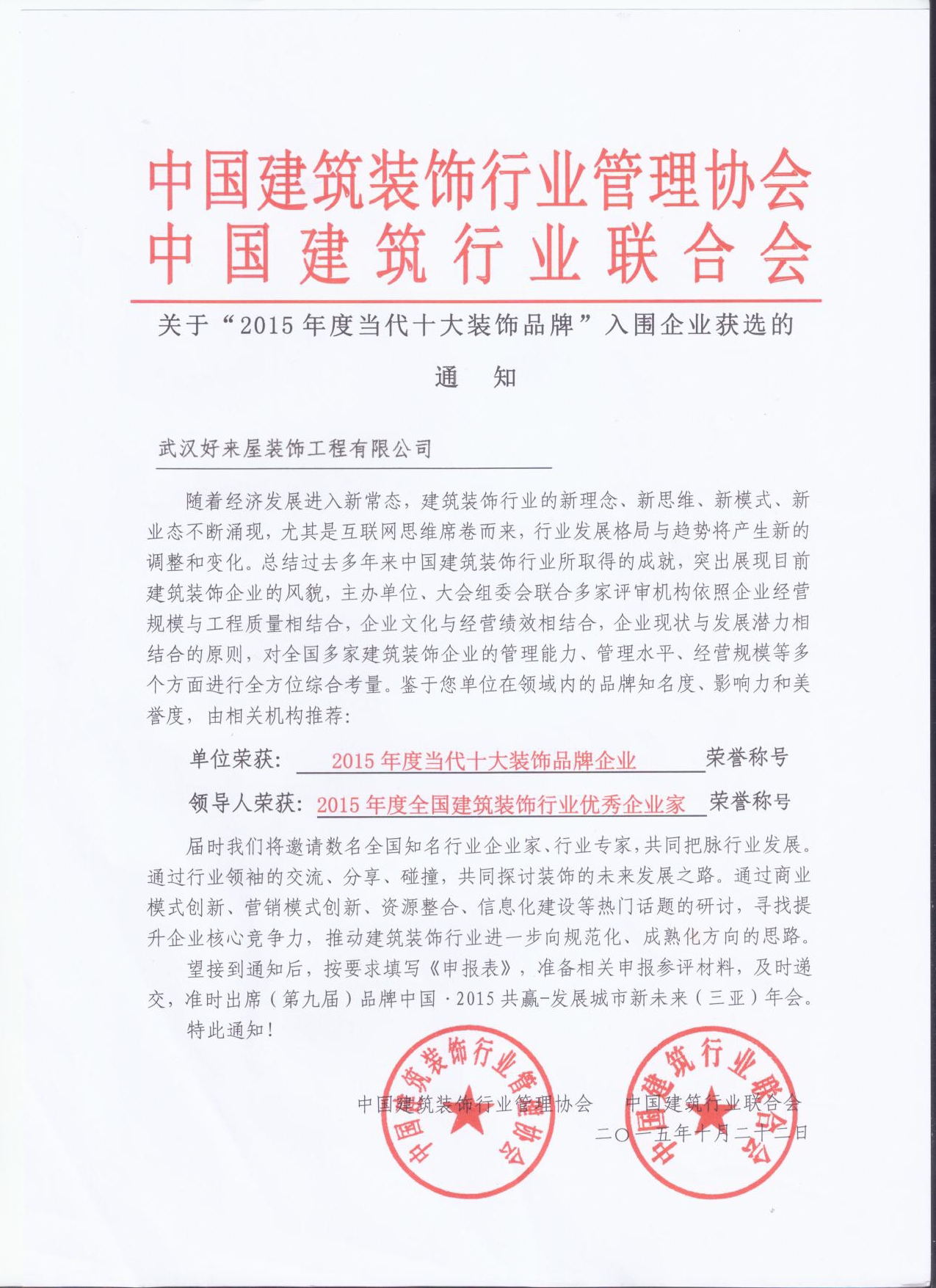 单位荣获:2015年度当代十大装饰品牌企业荣誉称号