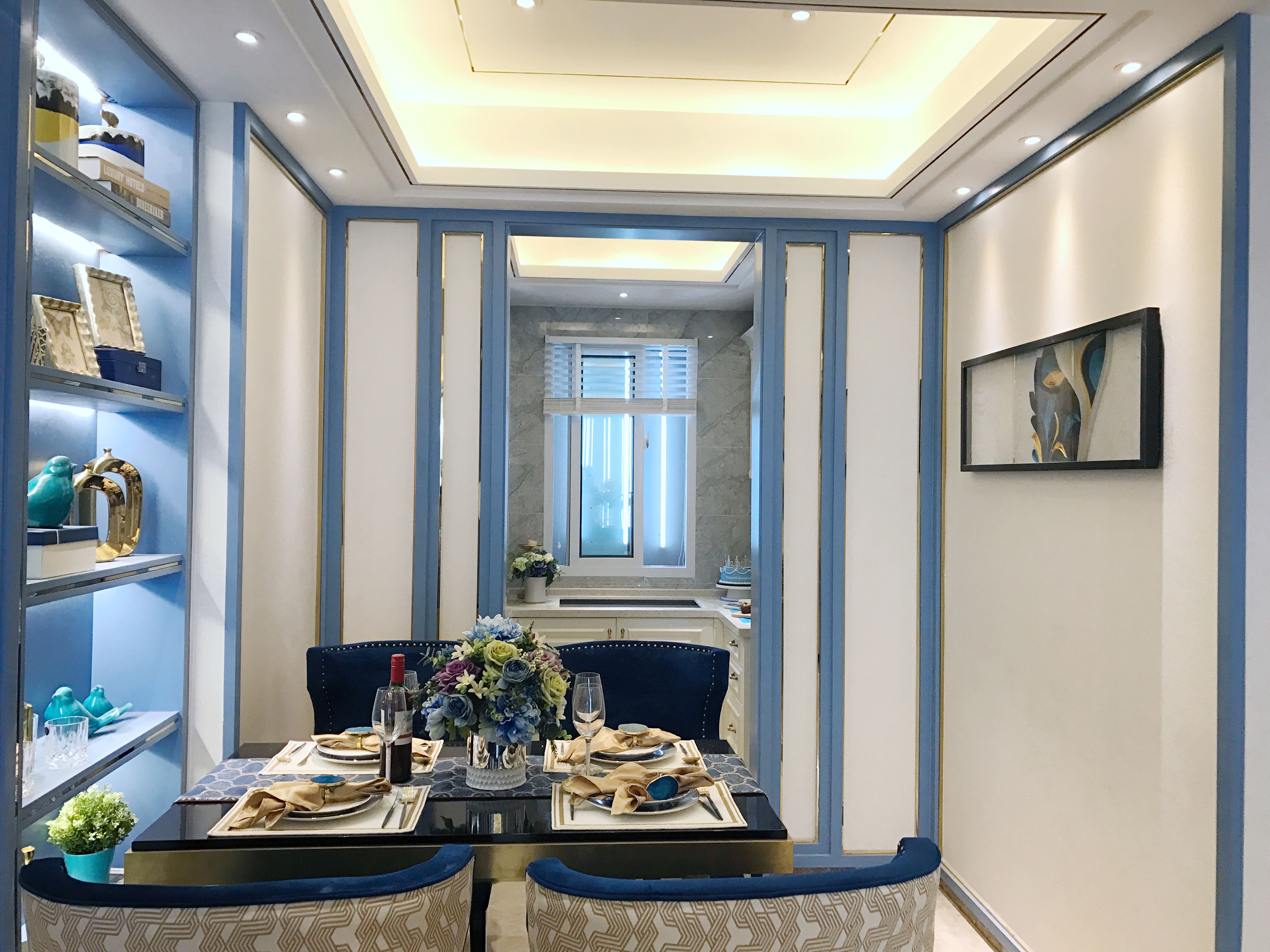 富有立体感的蓝灰色造型背景,配以明亮的不锈钢和素色墙布,给人一种视觉上的冲击,多层次的尺寸把控和收边收口处理,讲究的是对工艺的精控。