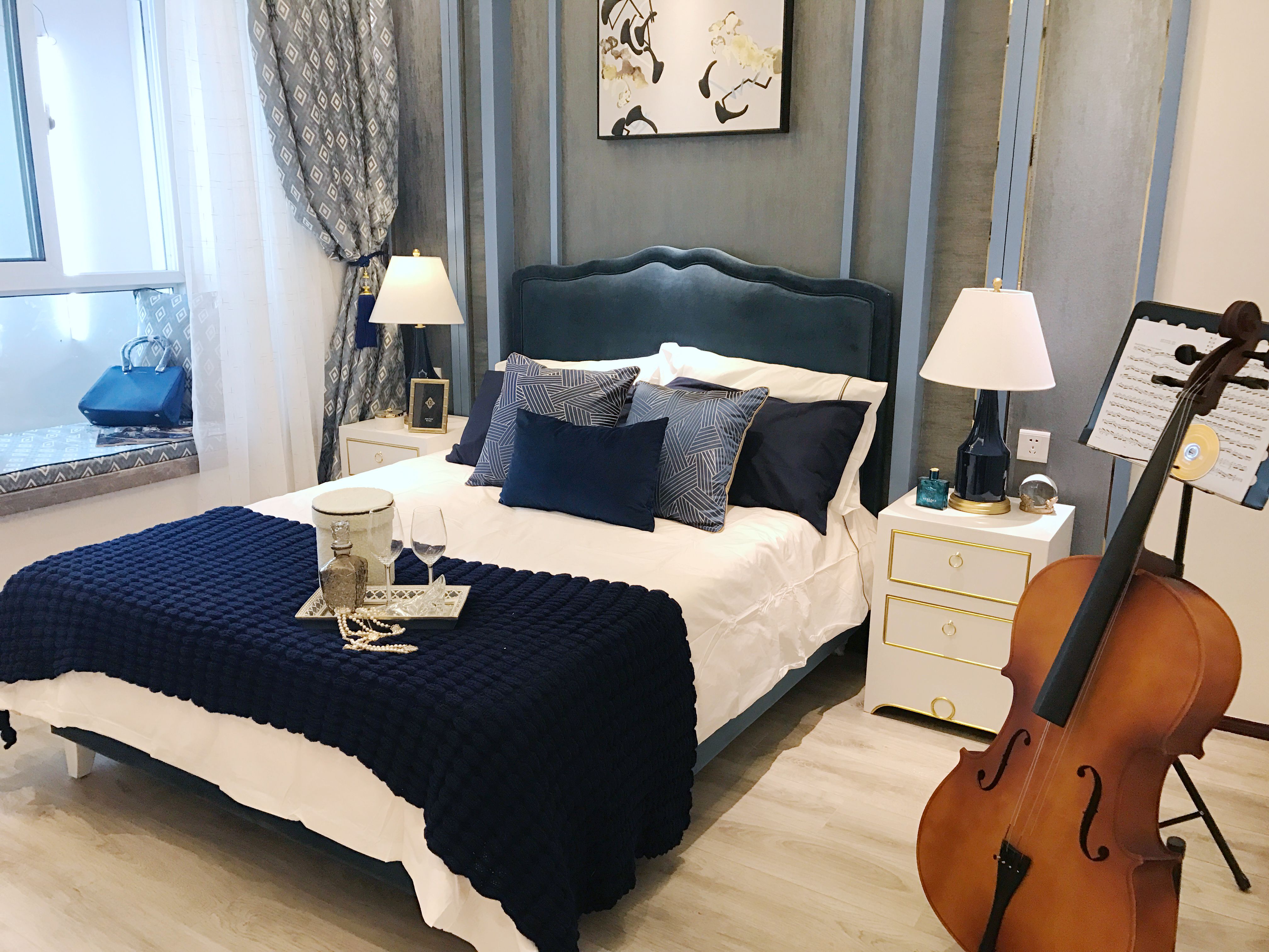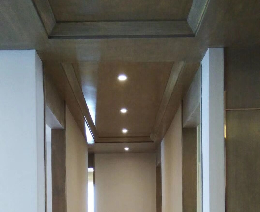 空间硬装融入了东方的装饰元素,新式的表现手法和对材料的特别处理,软装在延续硬装的基础上,通过欧式风格诠释对此空间的设计。墙面木饰面、门套,吊顶木饰面均为现场施工木器漆,墙布的基层处理、与木饰面收口精细施工,是项目管理的一大亮点。